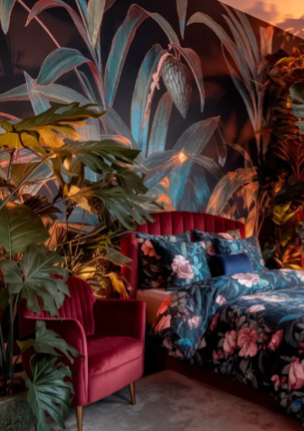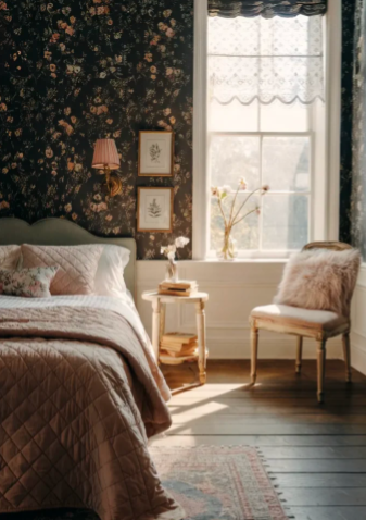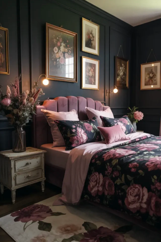 Dark floral prints effortlessly bring romance to a bedroom. Using wallpaper, duvets, or accent fabrics with large blooms creates a bold focal point. Keep surrounding colors muted—like charcoal, navy, or eggplant—so the florals stand out without overwhelming the space.
