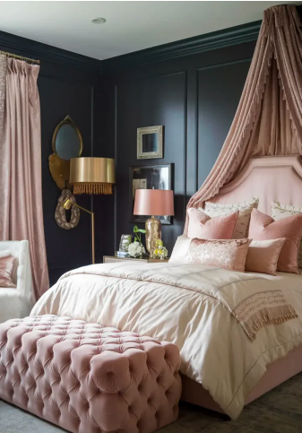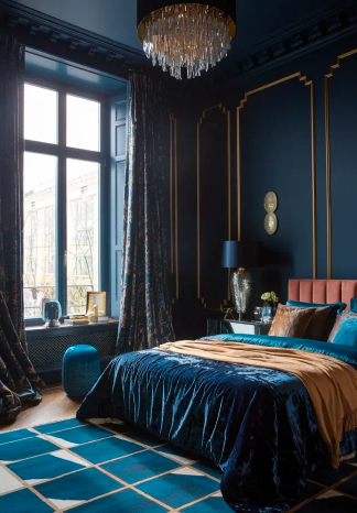 Dark navy creates a calm and sophisticated base for a bedroom. It pairs well with metallics, natural wood, or crisp whites. Soft contrasting accents, like pale pink pillows or light linen sheets, add warmth and feminine softness.