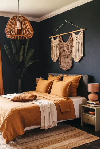 Incorporating boho-inspired elements like macrame, rattan lighting, or woven baskets adds personality to a moody dark bedroom. Earthy tones like rust, mustard, or clay pop beautifully against navy or charcoal walls, and layered rugs make the room feel layered and cozy.