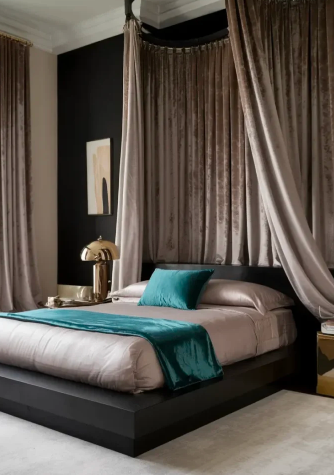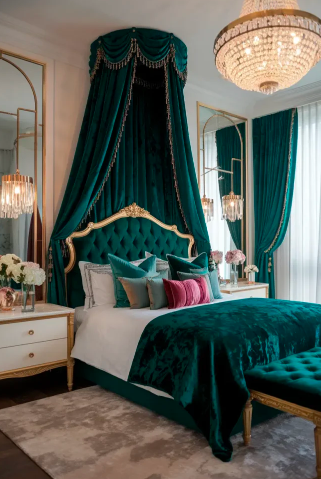 Velvet and silk textures complement the color beautifully, making your bedroom feel indulgent and serene—a perfect sanctuary for rest and style.