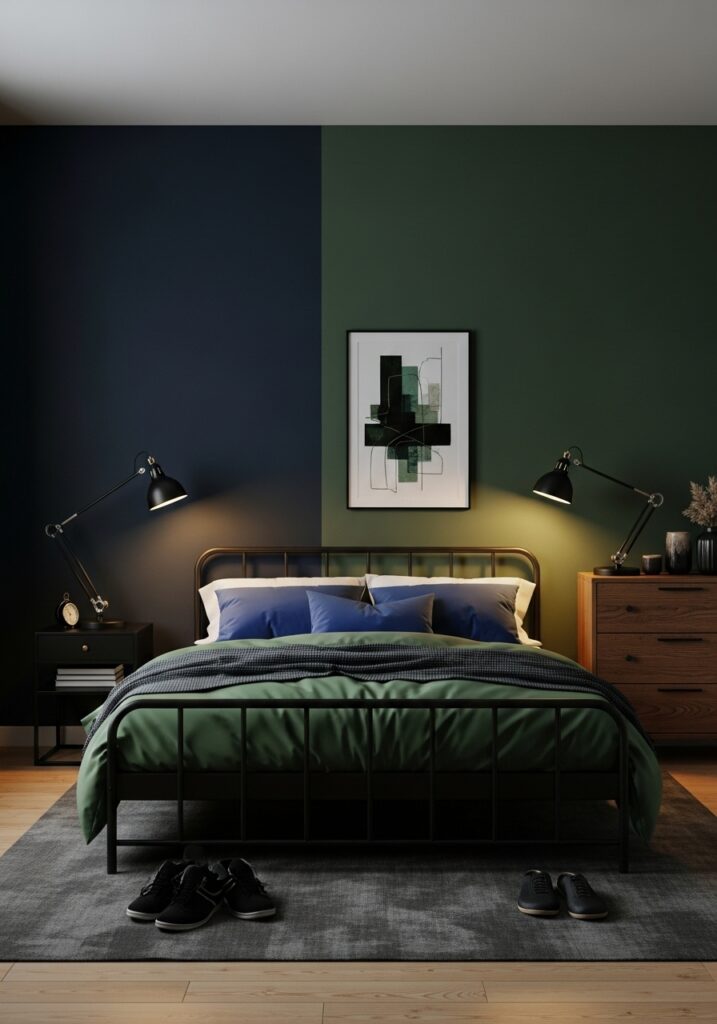 For a more creative approach, Green and Blue Bedroom Ideas can take on a bold, modern edge. Geometric paint designs, color blocking, and striking contrasts between bright or muted tones add personality and visual interest. Instead of covering every wall in color, some designs use furniture, artwork, or statement pieces to introduce green and blue in unexpected ways. High-energy combinations create a playful, artistic vibe, while gray-based shades offer a more subtle and contemporary interpretation. These approaches prove that the pairing of green and blue is versatile enough to suit minimalist spaces as well as expressive, eclectic interiors.