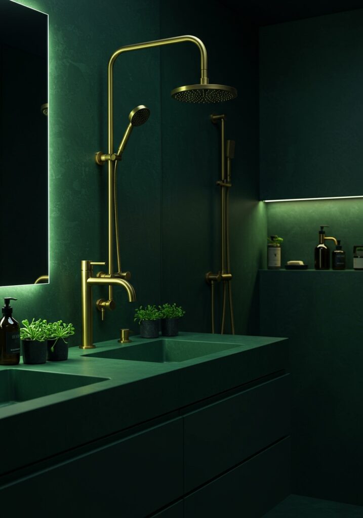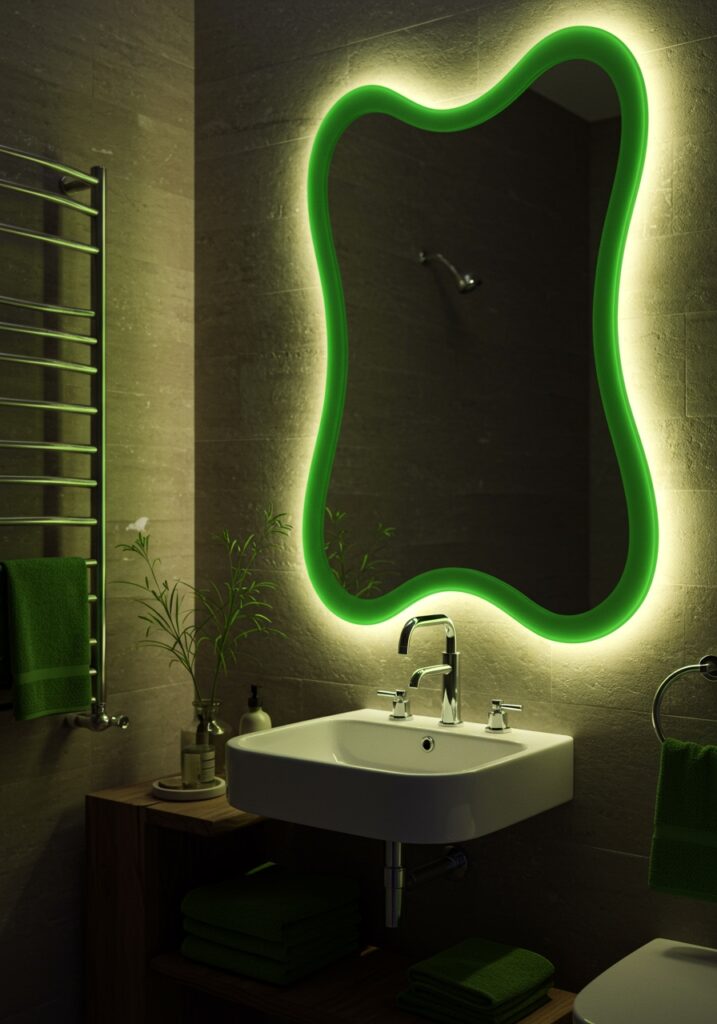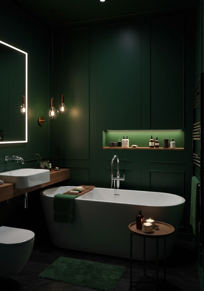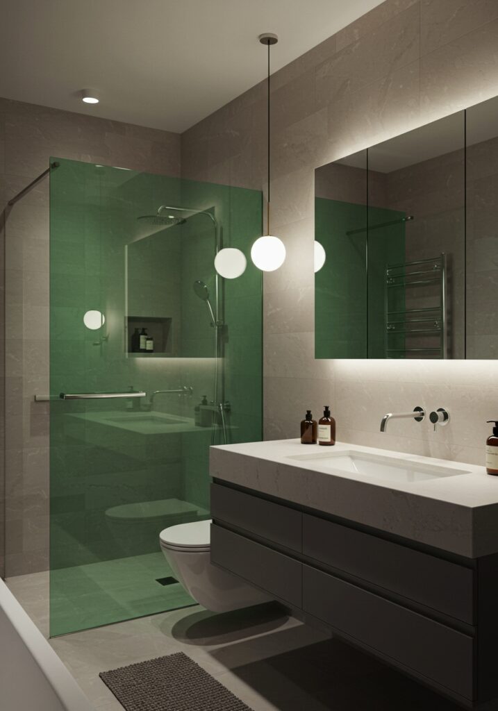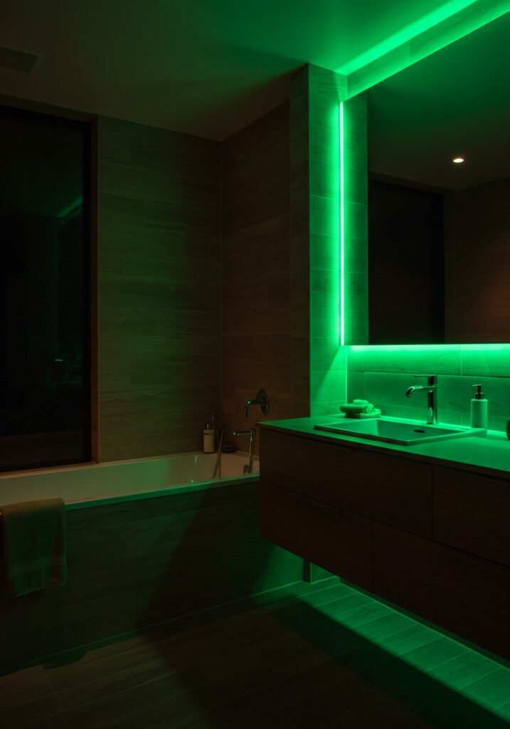 I balance green lighting with warm tones so the bathroom stays comfortable and not too cold.