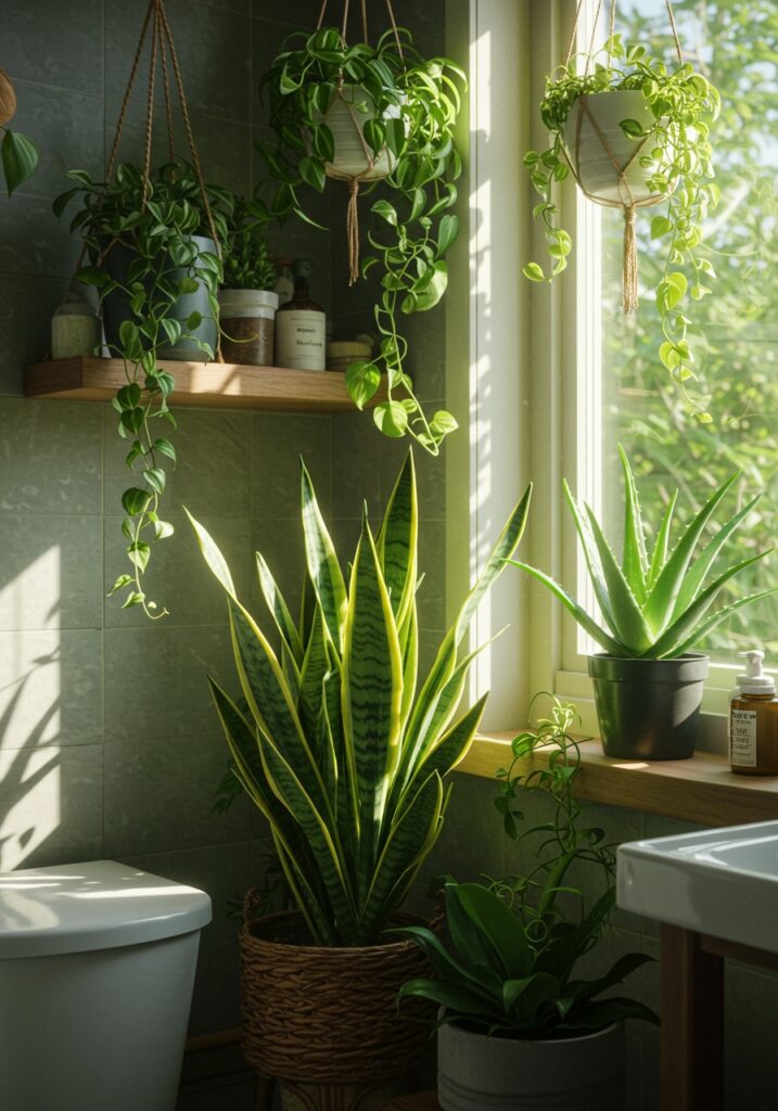 I place plants near mirrors or shelves to save floor space and keep the bathroom open.