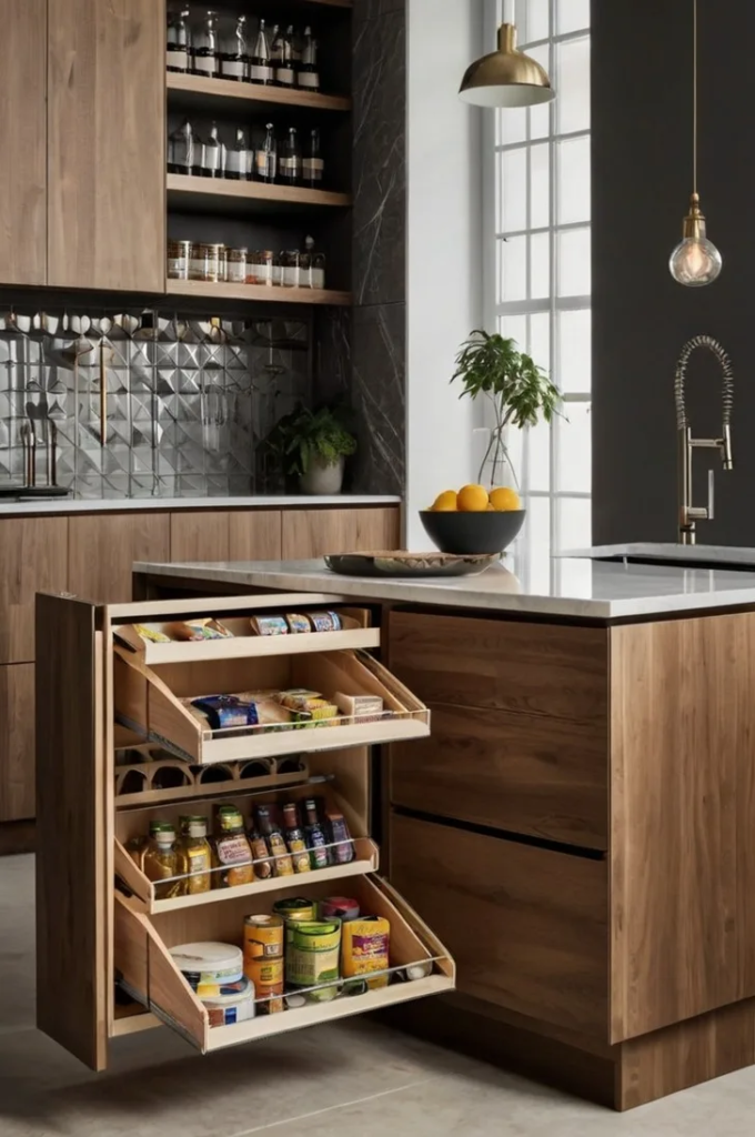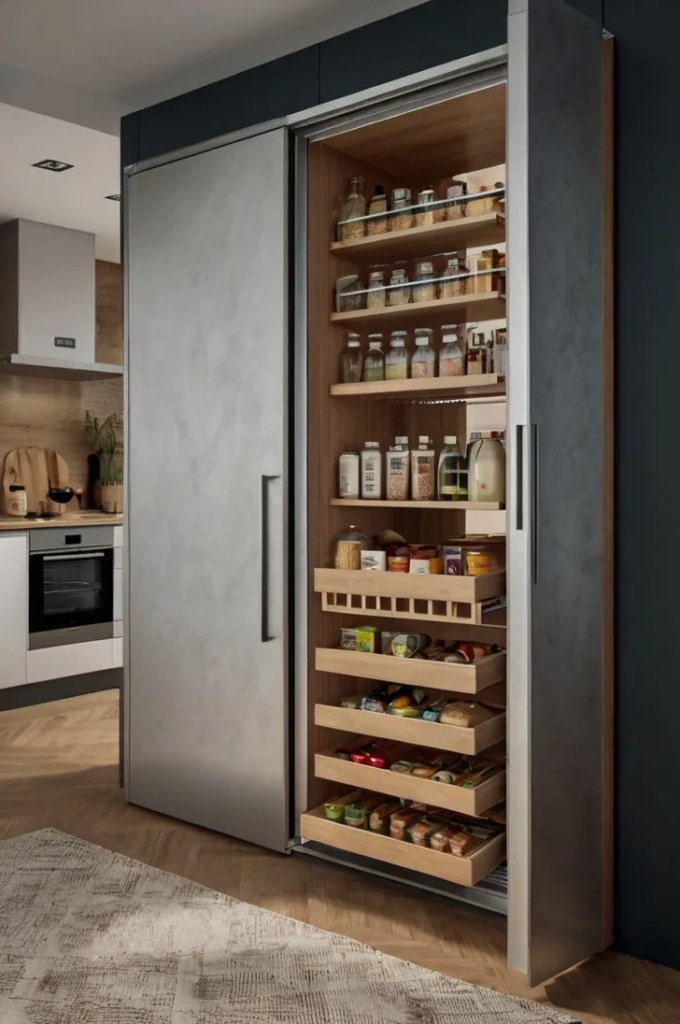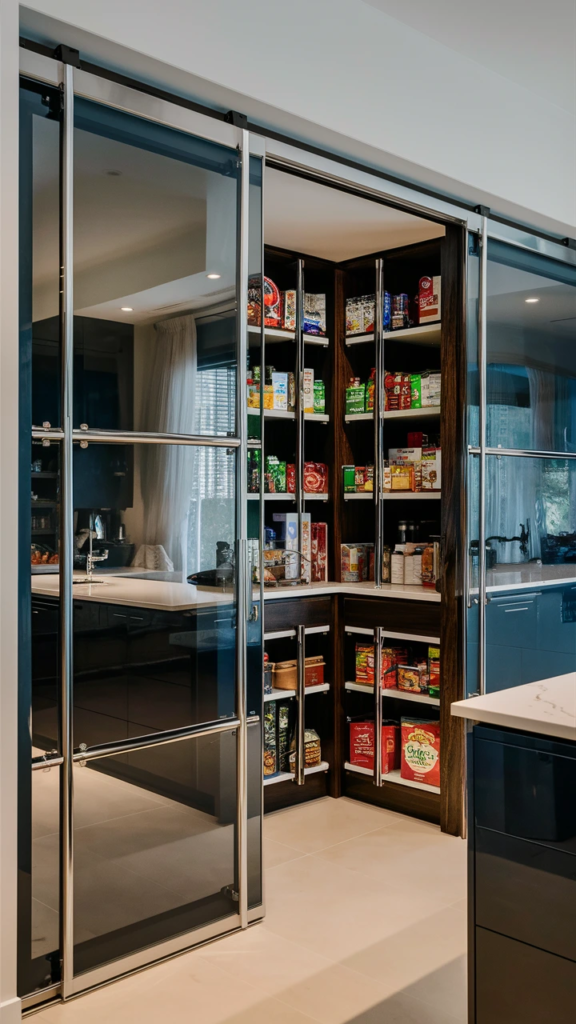 This idea uses sliding doors to hide pantry shelves while also serving as a visual feature. It saves space and keeps the kitchen looking neat, making it both practical and visually appealing.