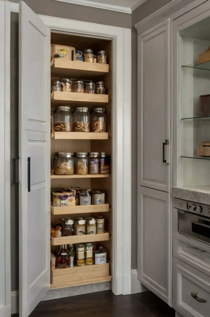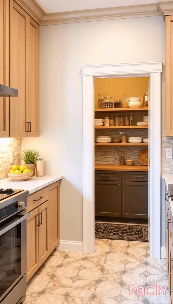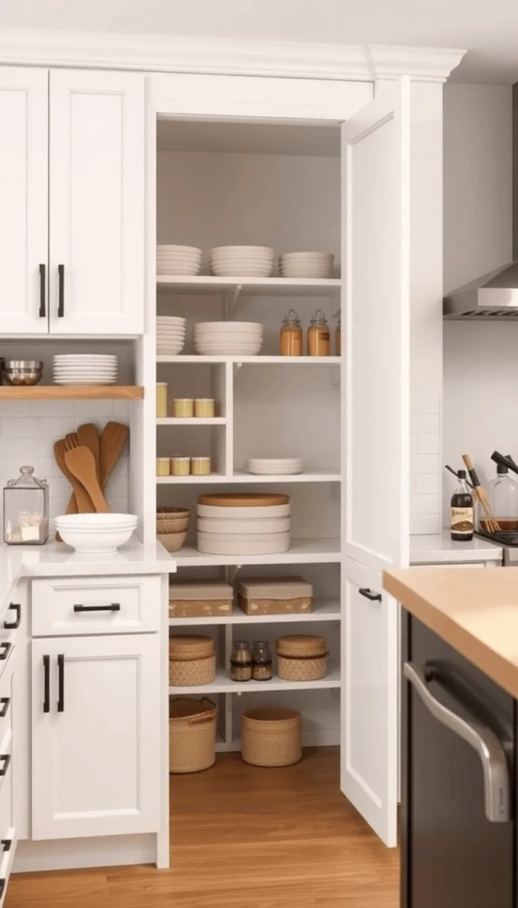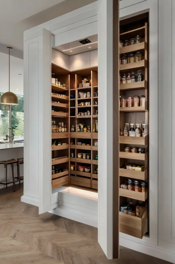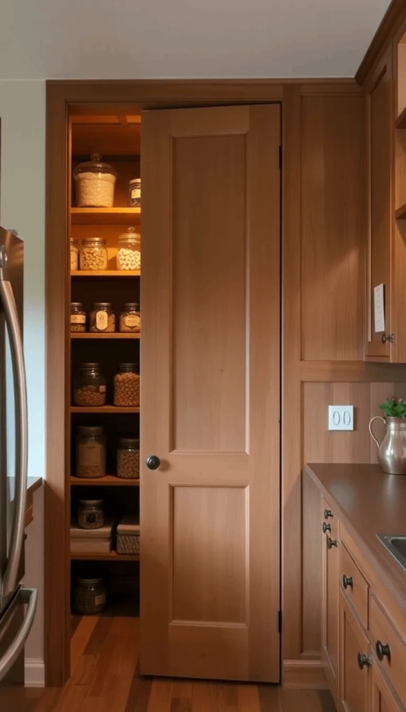 This design hides a larger pantry behind a disguised entry, adding a sense of surprise. It’s especially useful for storing bulk items and appliances in spacious kitchens.
