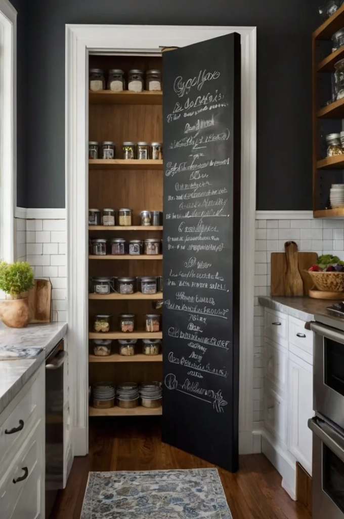 A chalkboard door hides the pantry while also serving as a writing surface. It adds both practicality and a playful element to the kitchen.