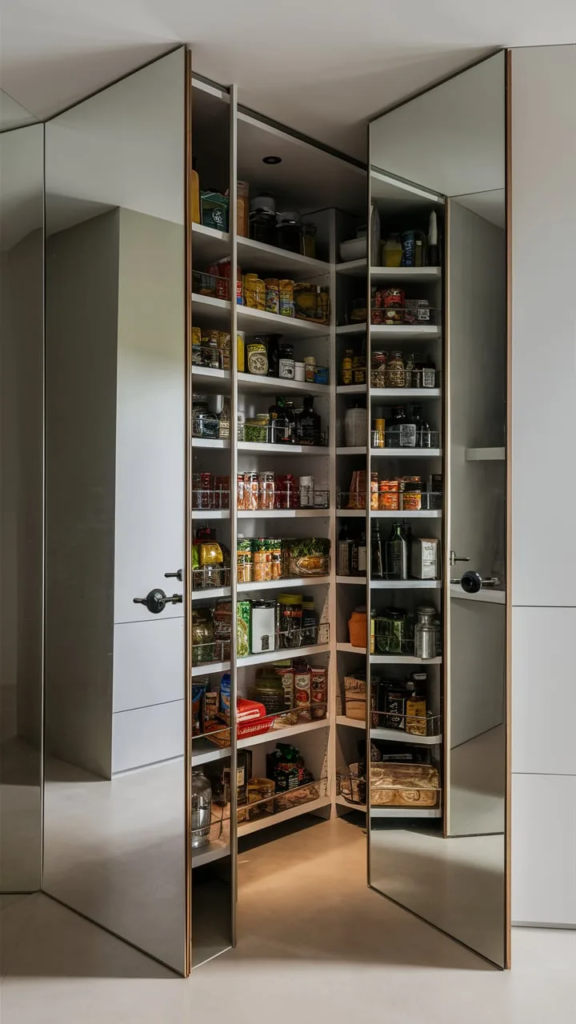 Using a mirror as the pantry door keeps storage hidden while visually expanding the kitchen. This approach is especially helpful in compact spaces.