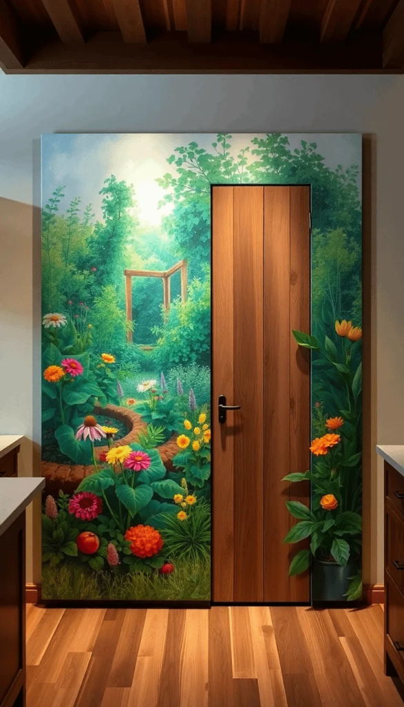 The pantry entrance is concealed behind artwork, allowing storage to remain hidden while contributing to the room’s decorative appeal.