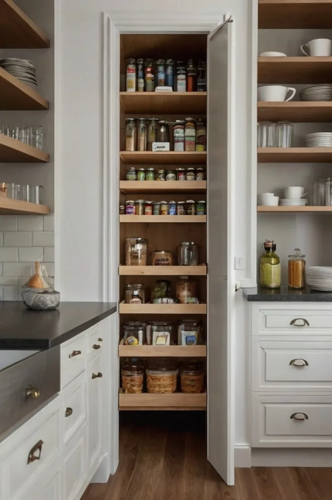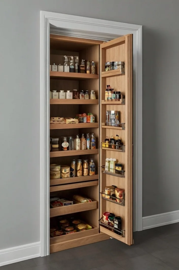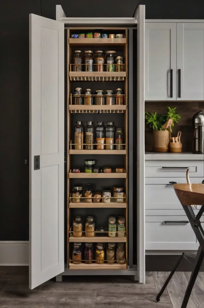 The pantry is disguised as a standard cabinet, blending into the kitchen layout. It provides hidden storage without drawing attention.