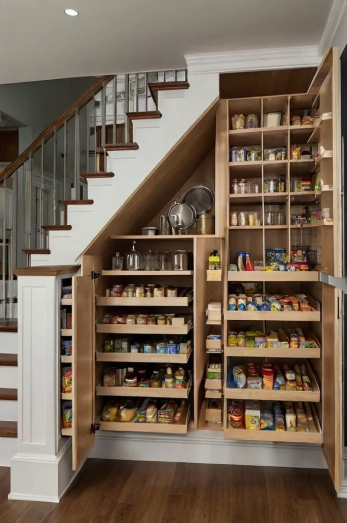 Space beneath stairs is repurposed into a hidden pantry. This approach makes use of areas that are often overlooked.