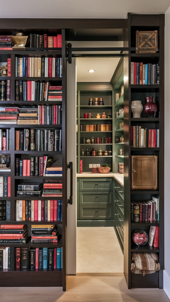 A sliding bookshelf hides the pantry while offering additional space for books or decor. It combines storage with a creative design feature.