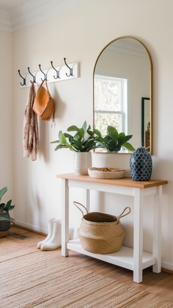 Adding hooks, mirrors, or slim tables improves organization while enhancing style. Mirrors also reflect light, making smaller spaces appear larger.