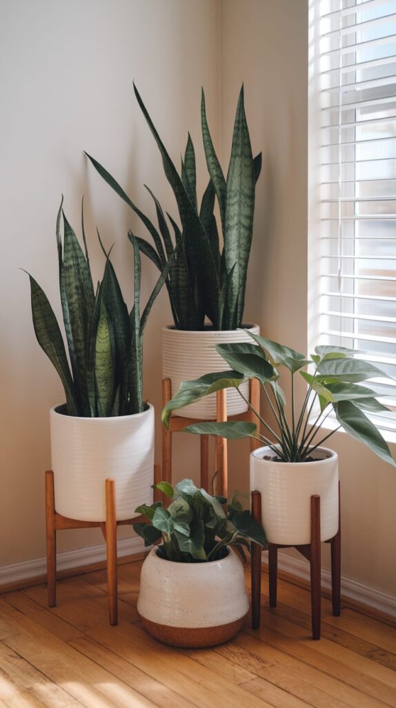 Hardy plants like snake plants or pothos thrive with minimal care. Placing them near natural light enhances their impact while keeping maintenance simple.