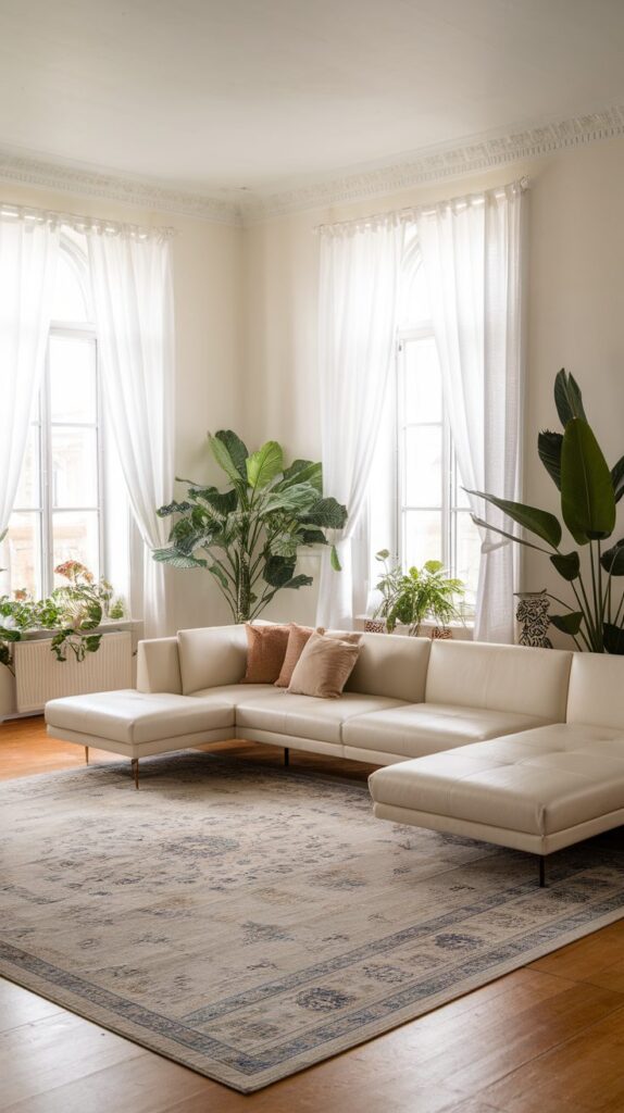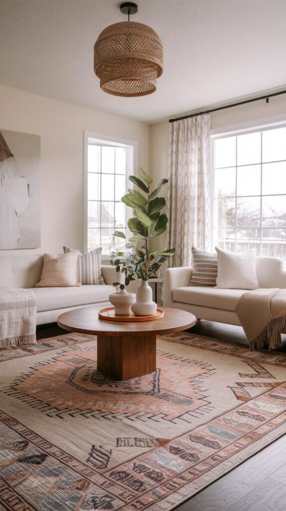Choosing the correct rug size ensures furniture sits comfortably within the layout. Larger rugs often make rooms feel more spacious and cohesive, while undersized rugs can shrink the visual space.