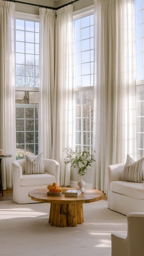Replacing heavy treatments with lighter fabrics allows more natural light to enter. Hanging curtain rods slightly higher creates the illusion of taller ceilings. These small adjustments make rooms feel open and refreshed.
