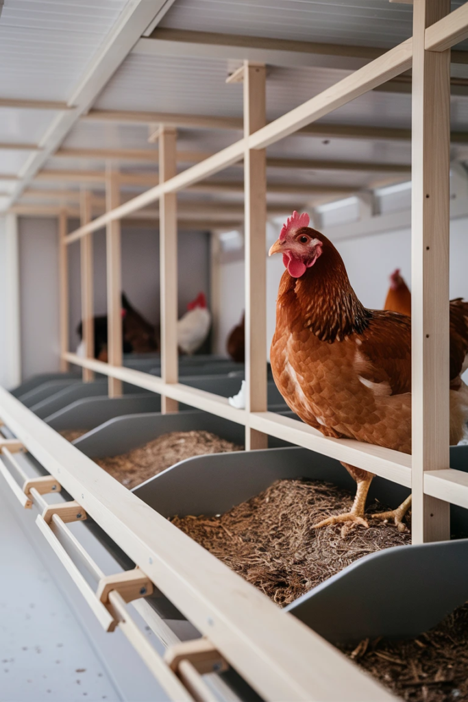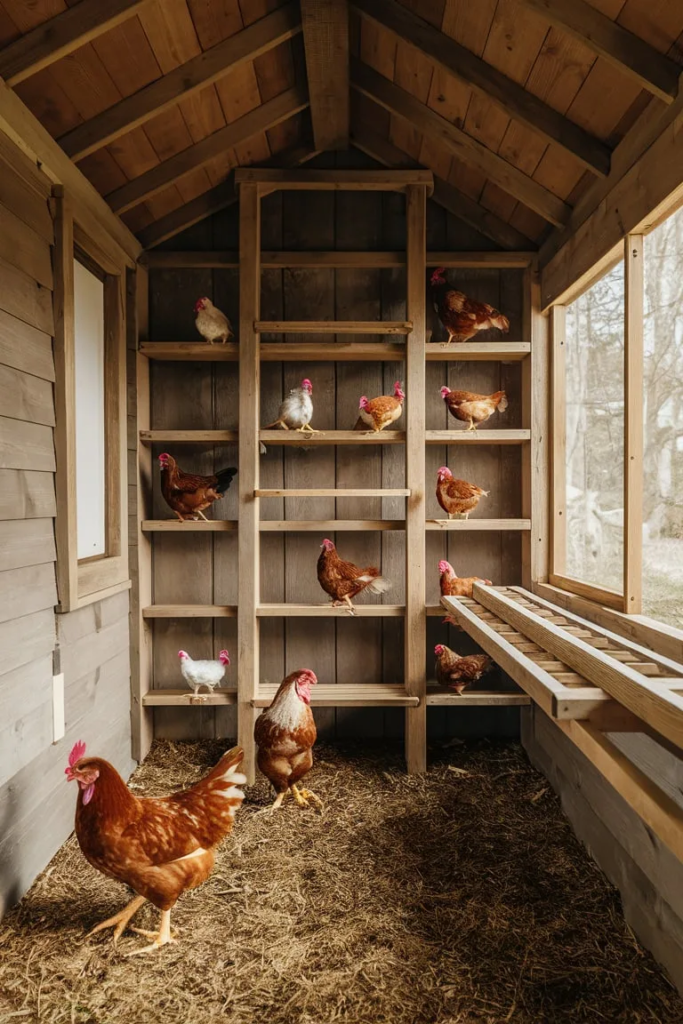 Ladder-style perches offer multiple roosting levels, allowing chickens to move naturally and choose their preferred height. This design supports a peaceful social structure within the flock and makes excellent use of vertical space without overcrowding.