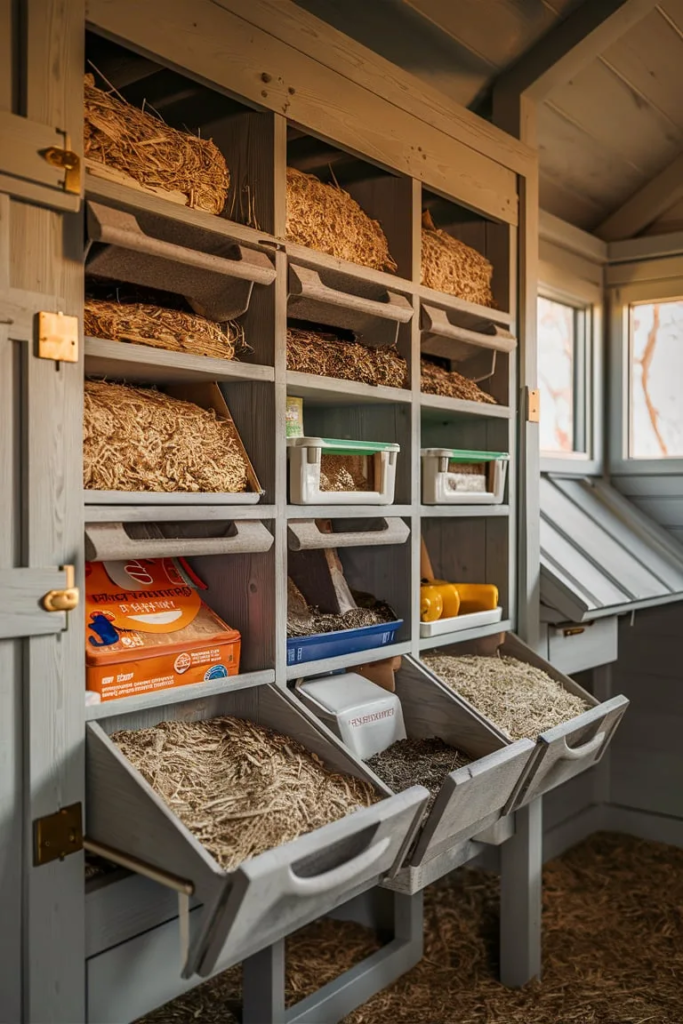 Built-in storage keeps feed, bedding, and tools organized and close at hand. When everything has a designated place, daily tasks become quicker and more efficient. Proper storage also protects supplies from moisture and pests while keeping the coop clutter-free.