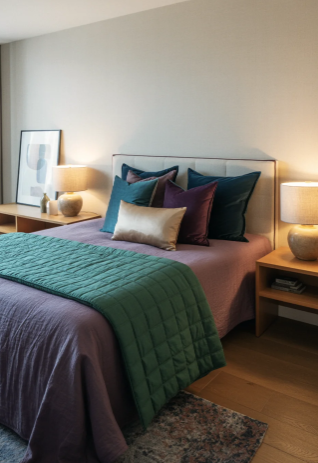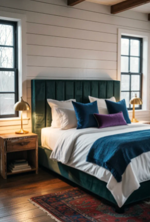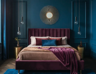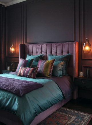 Deep plum and rich blue tones create a layered and luxurious look that works beautifully in Jewel Tone Designs for a Dramatic Bedroom. When tall headboards, plush bedding, and soft lighting come together, the room begins to feel elegant and comfortable at the same time.