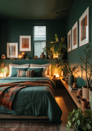 Dim lighting helps highlight the depth of these darker colors, making the bedroom feel calm and slightly dramatic during the evening hours. Soft textiles like velvet throws, thick blankets, or decorative cushions help build that cozy layered effect that many jewel-toned bedrooms share.
