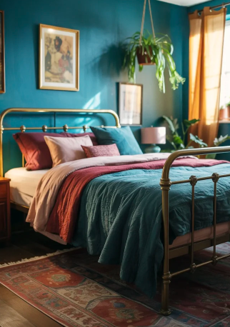 Soft fabrics help balance the bold wall color. Textured blankets, plush cushions, and layered rugs make the room feel comfortable while allowing the teal tones to remain the focal point. The combination of strong color and cozy textiles creates a bedroom that feels inviting and elegant.