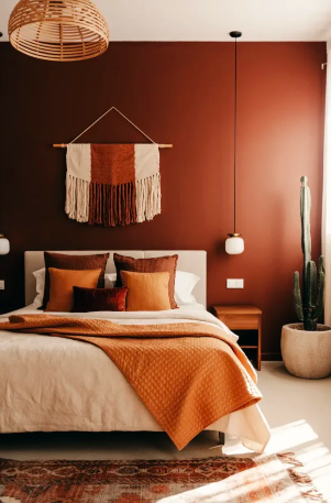 Rust and terracotta accents complement burgundy beautifully, bringing additional warmth without overpowering the design. Bedding, pillows, or decorative pieces in these tones add layers of color that make the bedroom feel rich and thoughtfully styled.
