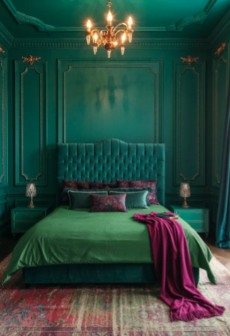 For those who love bold interiors, emerald can take Jewel Tone Designs for a Dramatic Bedroom to a glamorous level. Paneled walls in deep green paired with velvet furniture create a striking visual effect that feels luxurious and dramatic.