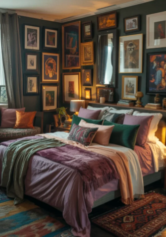 Artwork is often the centerpiece of this style. Gallery walls filled with paintings, photographs, or graphic prints turn the bedroom into a personal showcase of creativity. The variety of pieces adds character while complementing the jewel-tone palette.