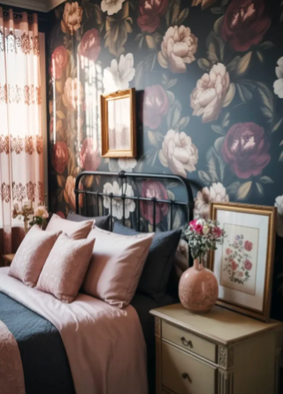 Floral wallpaper in darker shades adds a romantic and slightly mysterious feeling to Jewel Tone Designs for a Dramatic Bedroom. The combination of bold color and nature-inspired patterns creates a space that feels elegant and cozy at the same time.