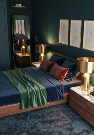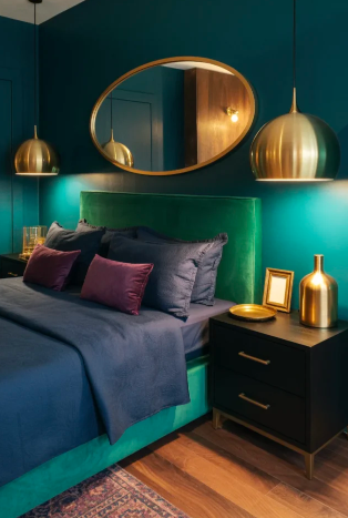 Combining jewel tones with metallic accents results in a bedroom that feels balanced, dramatic, and polished.