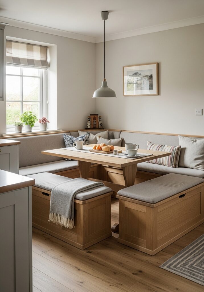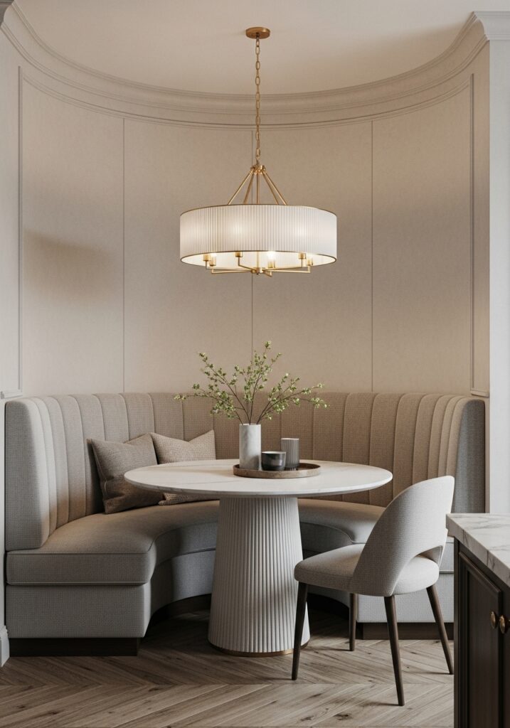 An L-shaped banquette tucked into a corner is one of the most efficient layouts available. It allows more people to sit comfortably while using space that might otherwise go unused. This setup is especially helpful for families who want a practical seating option that doesn’t overwhelm the room.