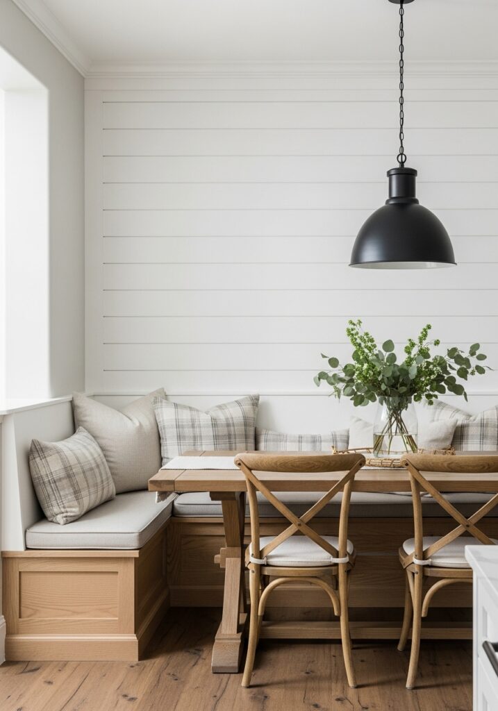 A banquette with shiplap backing and warm wood details creates a welcoming farmhouse feel. This style feels timeless and relaxed, making it a popular choice for kitchens that aim to feel both comfortable and durable.