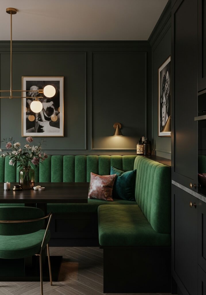 Dark upholstery and rich fabrics can give banquette seating a bold, upscale look. Deep colors add depth and contrast, making the seating area feel intentional and sophisticated rather than purely casual.