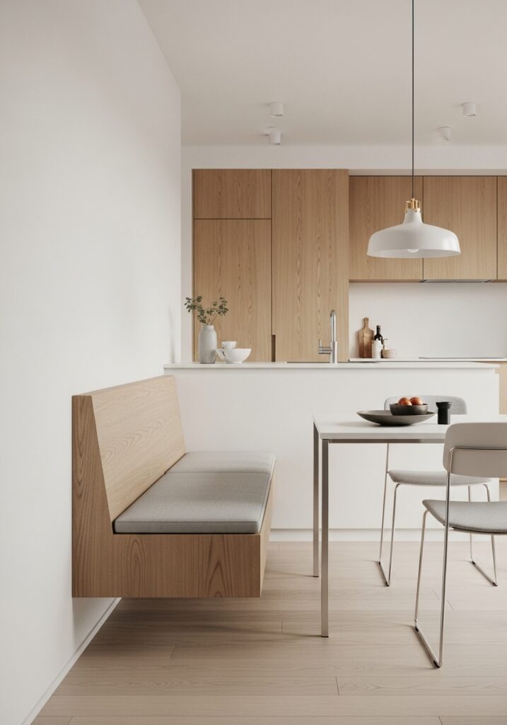 When corners are not available, a straight bench placed along a wall can still provide the benefits of banquette seating. Paired with a table and chairs on the opposite side, this layout keeps walkways open and makes the kitchen feel more organized and spacious.