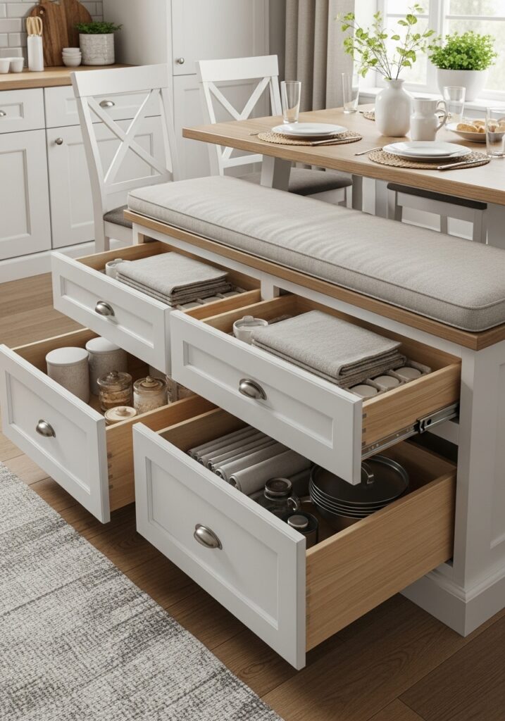Drawers built into the base of a banquette are easier to access than lift-top storage. They work well for everyday items like linens, placemats, or children’s supplies and help keep everything organized without disrupting the look of the seating.