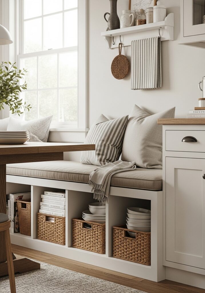 Many Kitchen Banquette Seating Ideas include built-in storage under the bench. This storage can be accessed through lift-top seats, drawers, or open cubbies, making it useful for storing kitchen items, linens, or rarely used cookware.