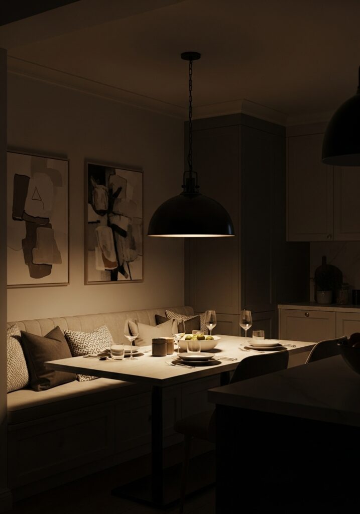 A well-chosen light fixture above the banquette anchors the seating area visually. Proper lighting creates a sense of intimacy while clearly defining the dining space within the larger kitchen.