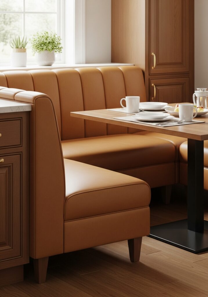 Durable and easy-to-clean fabrics are ideal for kitchen banquettes. Leather, faux leather, performance fabrics, and tightly woven upholstery are commonly used in Kitchen Banquette Seating Ideas because they handle spills and daily wear more effectively.