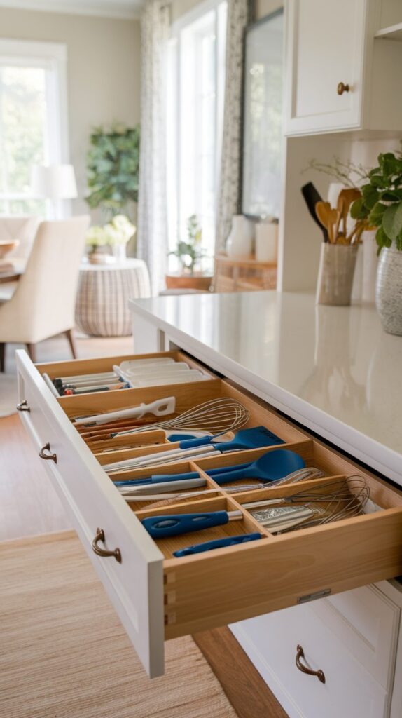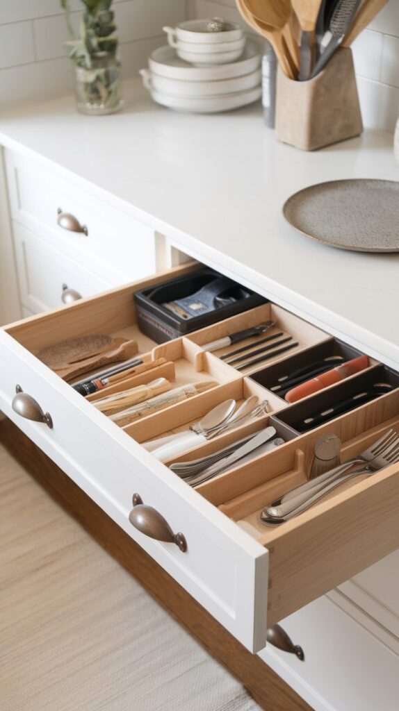 Adjustable dividers offer one of the most useful Kitchen Drawer Organization Ideas because they adapt to what you actually own. Unlike fixed organizers that lock you into a single layout, adjustable options let you shift sections as your needs change. You can create slim compartments for knives and wider spaces for bulkier utensils without wasting room. This flexibility keeps drawers functional over time instead of forcing you to reorganize constantly. Placing frequently used tools toward the front also saves time during meal prep. Choosing sturdy materials like bamboo or durable plastic prevents slipping and sliding, which helps maintain order long term. Investing in quality dividers once means you won’t need to redo the system again and again.