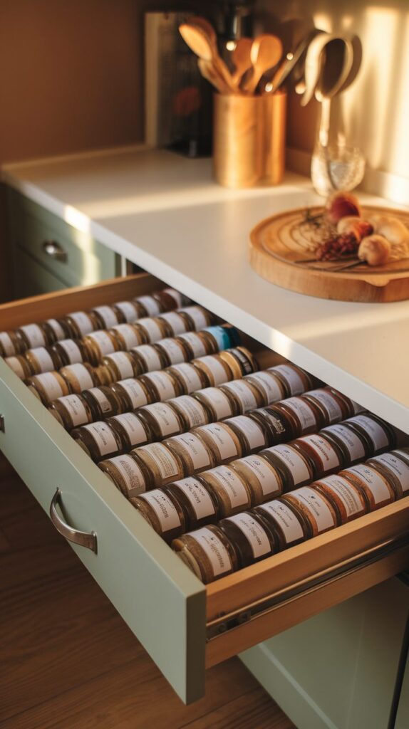 Keeping spices inside a shallow drawer with labels facing up makes cooking more efficient. Instead of searching through crowded cabinets, you can see every jar at once. Uniform containers help create a tidy look and make labels easier to read. Adding a non-slip liner prevents jars from sliding when the drawer opens and closes. Shallow drawers work best because deeper spaces allow items to roll and disrupt the layout. Organizing spices alphabetically or by cuisine keeps the system simple to maintain. Among practical Kitchen Drawer Organization Ideas, this one reduces duplicate purchases and saves time during meal prep.
