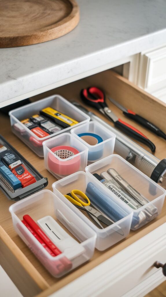 Most kitchens have a junk drawer, but it doesn’t have to feel chaotic. Dividing the space with small bins transforms scattered items into organized groups. Batteries, tools, rubber bands, and notepads each get their own section, which limits clutter. Clear bins are especially helpful because you can see what’s inside instantly. Regularly sorting through the drawer prevents buildup and keeps it functional. Accepting that a junk drawer exists while managing it smartly is one of the most realistic Kitchen Drawer Organization Ideas. Controlled organization feels far better than constant frustration.
