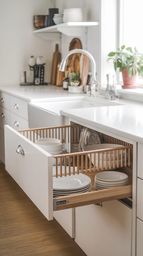 Drawer peg systems provide stability for plates and bowls, preventing them from sliding or chipping. Adjustable pegs allow you to customize spacing based on dish size, creating a secure fit. Lower drawers are ideal for this setup because they reduce bending and make unloading dishes easier. This method keeps dishes accessible while protecting them from damage. Seeing your dish collection clearly may also encourage mindful storage and prevent unnecessary purchases. As part of effective Kitchen Drawer Organization Ideas, peg systems combine safety with convenience in a practical way.