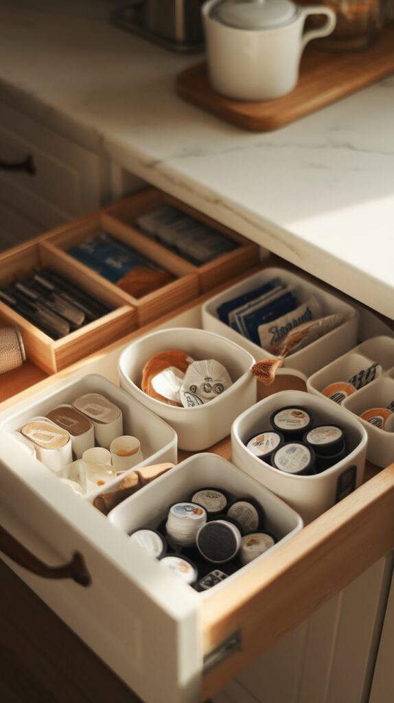 Keeping coffee and tea essentials in one drawer simplifies morning routines. Pods, filters, spoons, and sweeteners each have a designated spot, reducing unnecessary searching. Organizing items based on how you use them daily improves flow and convenience. Small containers prevent loose packets from spreading across the drawer. This setup also makes it easier for guests to help themselves without asking where things are. Thoughtful Kitchen Drawer Organization Ideas like this create calm during busy mornings. A simple drawer system can make the start of the day smoother.