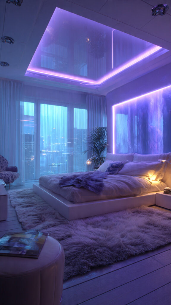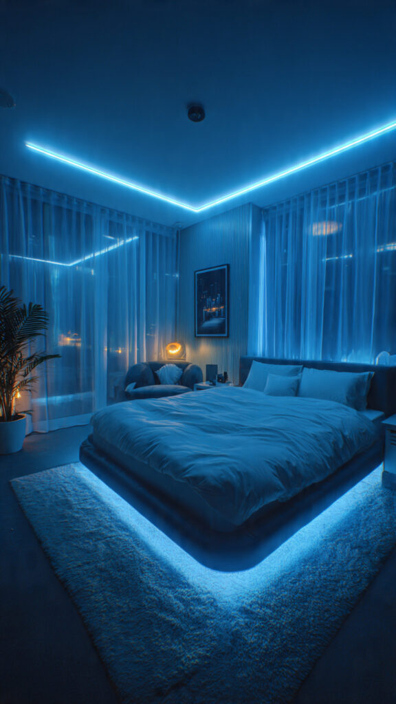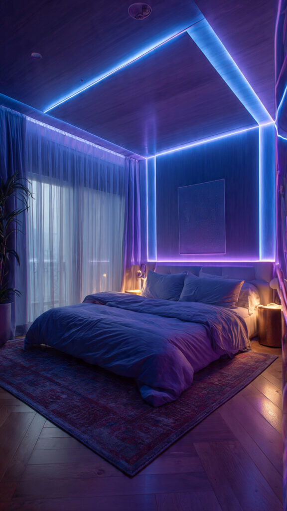 Ceilings are often ignored in bedroom design. Outlining the perimeter with LED rope lights introduces a subtle glow that changes the entire atmosphere. This is one of the more dramatic LED Light Bedroom Decor Ideas, yet it doesn’t overwhelm the space.