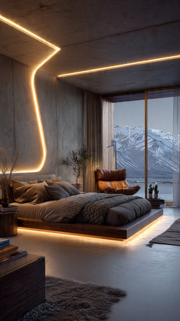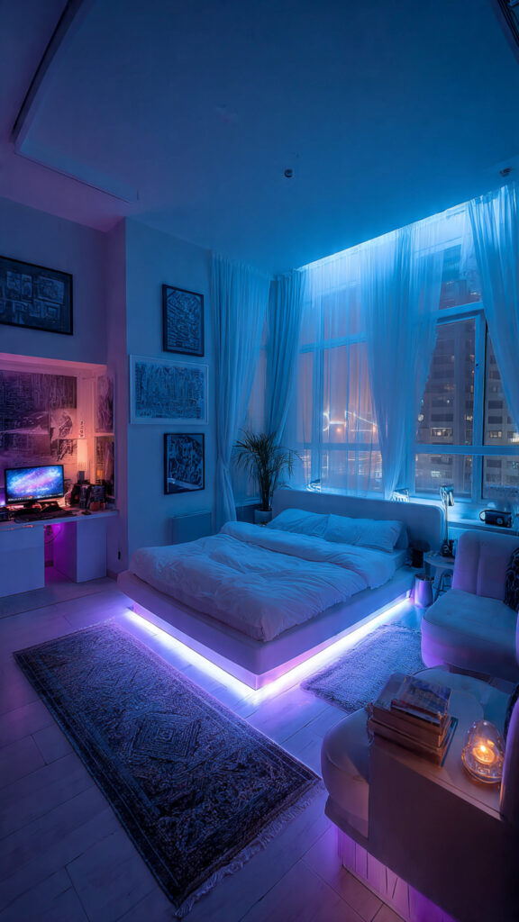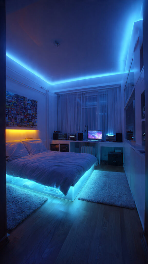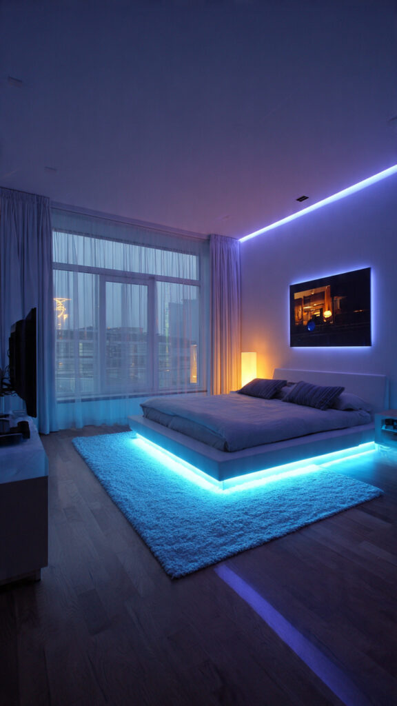 The area under a bed often feels dark and forgotten at night. Installing LED strips underneath changes that overlooked space into a soft glowing base that makes the bed appear lighter. This approach quickly becomes a favorite because it adds both style and function. It’s one of those LED Light Bedroom Decor Ideas that feels subtle but makes a big difference after sunset.
