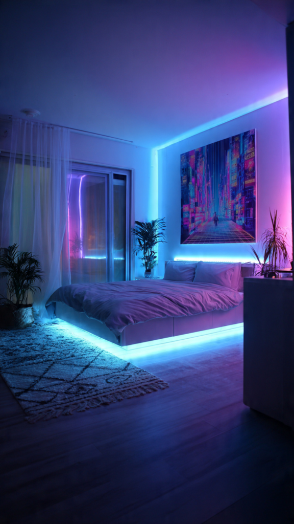 A plain wall can feel unfinished even in a clean bedroom. LED light panels introduce structure and geometric interest without cluttering the room. When used thoughtfully, they provide a bold yet balanced effect within LED Light Bedroom Decor Ideas.