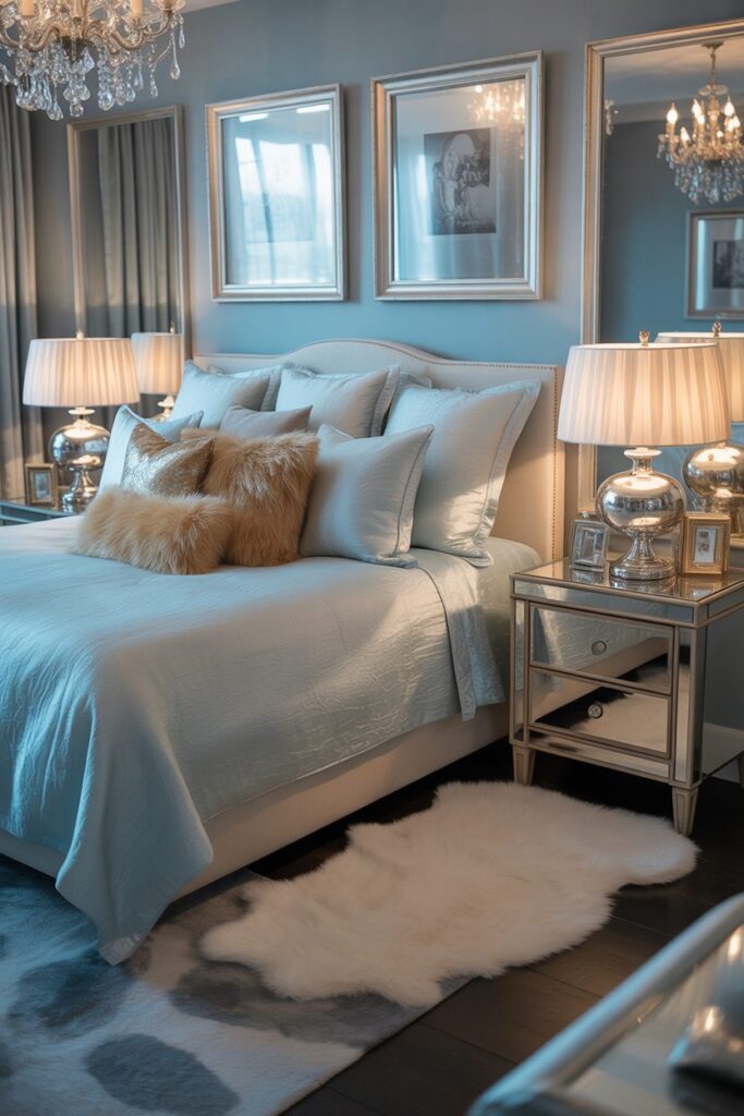 Metallic touches can instantly elevate a light blue bedroom. Gold or silver details in lighting fixtures, picture frames, or decorative items add shine without overwhelming the soft base color. Bedding with subtle metallic threads or decorative pillows with shimmer can bring a refined look. Mirrored furniture pieces reflect light, making the room feel brighter and more spacious. These Light Blue Bedroom Ideas are ideal for creating a space that feels elegant while still calm and welcoming.