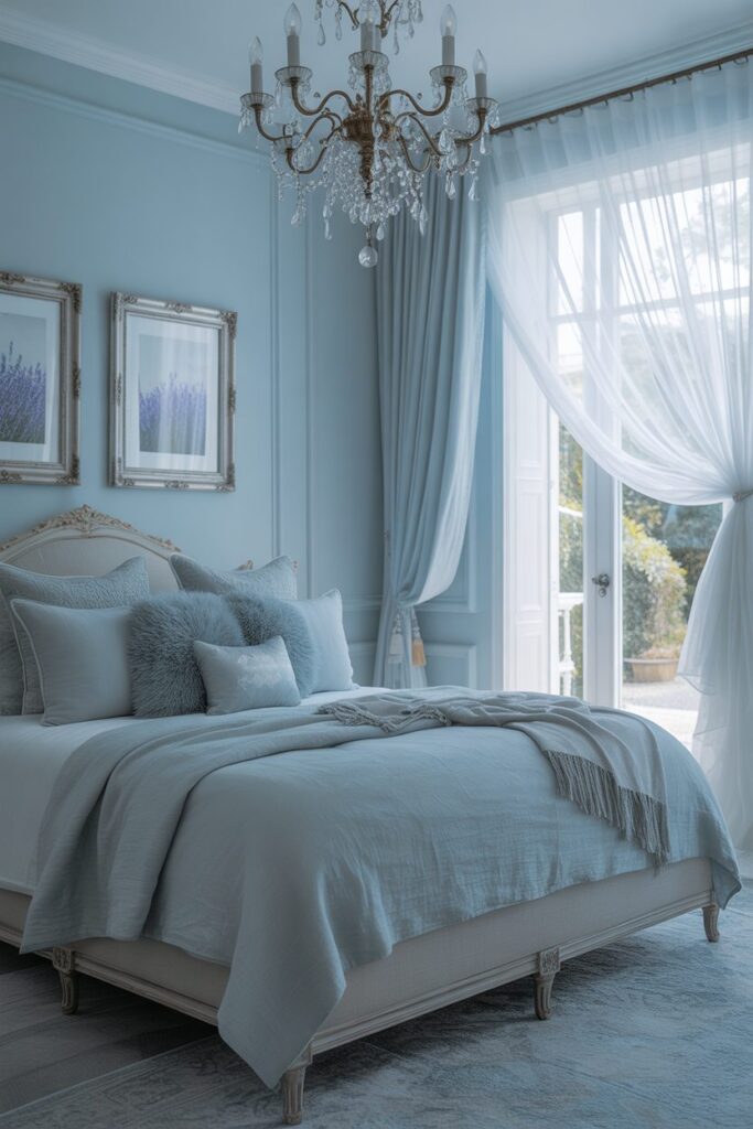 Light blue can also help create a romantic and dreamy atmosphere. Soft pastel tones paired with white or subtle silver accents add elegance without feeling heavy. Gentle lighting, such as a small chandelier or warm bedside lamps, enhances the cozy mood. Layered bedding with soft pillows adds comfort and visual depth. These Light Blue Bedroom Ideas are perfect if you want your bedroom to feel intimate, relaxing, and slightly luxurious while still keeping the overall look light and airy.