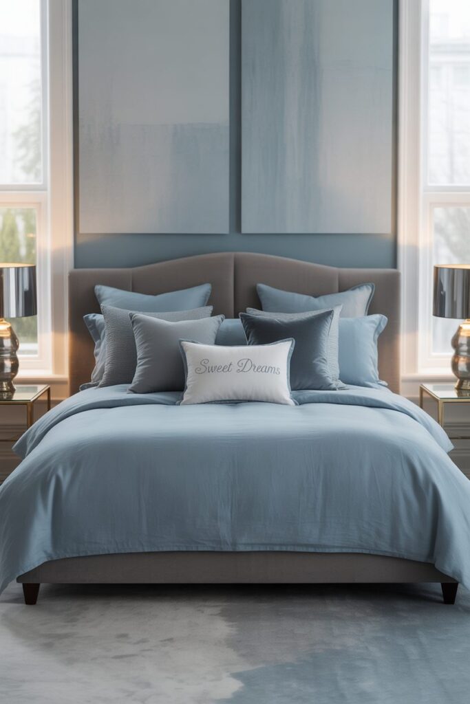 Light blue and grey together create a balanced and polished bedroom design. Grey adds depth, while light blue keeps the room from feeling too dark. An upholstered grey bed frame paired with soft blue bedding can instantly elevate the look. You can also paint the walls grey and use blue through decorative pieces for a layered effect. Subtle metallic details in lamps or frames can enhance the modern feel. These Light Blue Bedroom Ideas are ideal if you want something elegant yet soothing.