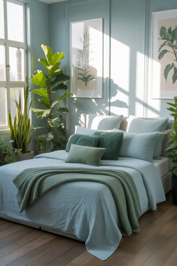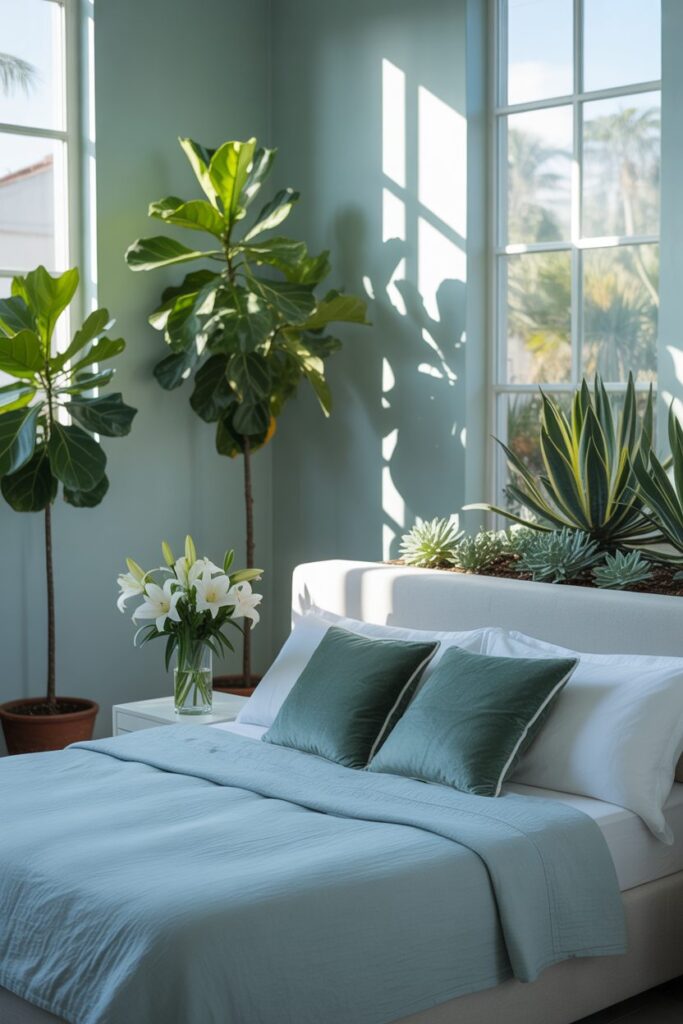 Greenery naturally complements light blue tones and makes the bedroom feel fresh. Larger indoor plants placed in corners can soften empty spaces. Smaller hanging planters near windows add dimension and interest. Fresh flowers on a bedside table or dresser bring subtle color and fragrance. These Light Blue Bedroom Ideas highlight how natural elements can enhance the overall calm feeling of the room.