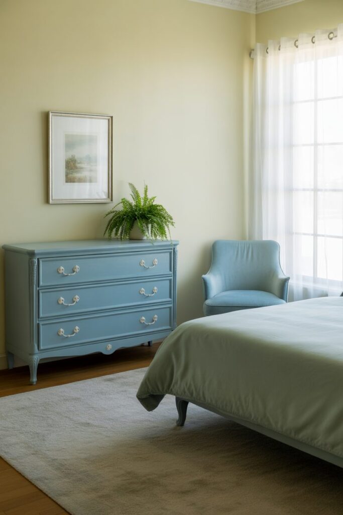 Instead of painting the walls, you can introduce light blue through furniture pieces. A dresser, nightstand, or accent chair in a soft blue shade adds personality without overwhelming the space. Keeping the rest of the room neutral allows the furniture to stand out naturally. Matching bedding or decorative accessories in similar tones helps tie everything together. This approach to Light Blue Bedroom Ideas works well if you want flexibility and prefer changing décor more easily in the future.